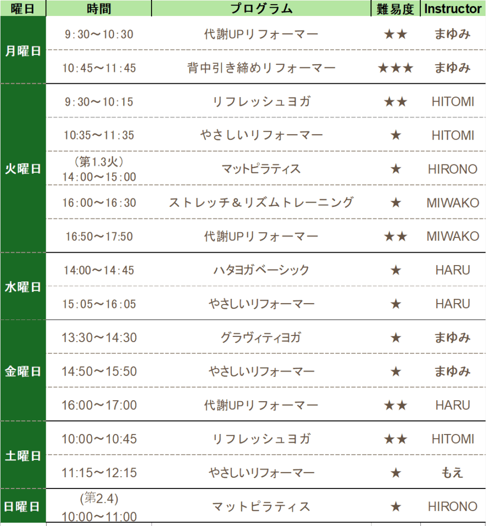 ナチュラルは他店スタジオとは異なり、少人数制での集団レッスンとなります。少人数制の方がインストラクターにとっても一人ひとりに寄り添いながら骨格や、姿勢を見ることが出来るので、より良いレッスンを提供できます。